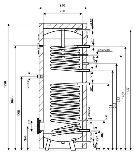 Melegvíz tároló zománcozott acélból- Beépített magnézium anódrúd- Két fűtő csőkígyó- Felső hőcserélő teljesítménye: 33 kW *- Alsó hőcserélő teljesítménye: 60 kW *- Tároló felfűtési ideje felső/alsó hőcserélővel 10 C-ról 45 C-ra: 37/28 perc- Felső hőcserélő felülete: 1,17 m2- Alsó hőcserélő felülete: 1,93 m2- Tömege víz nélkül: 198 kg- Hőveszteség: 3,6 kWh / 24 óra- Megengedett legnagyobb nyomás a tárolóban: 10 bar- Megengedett legnagyobb nyomás a hőcserélőben: 16 bar