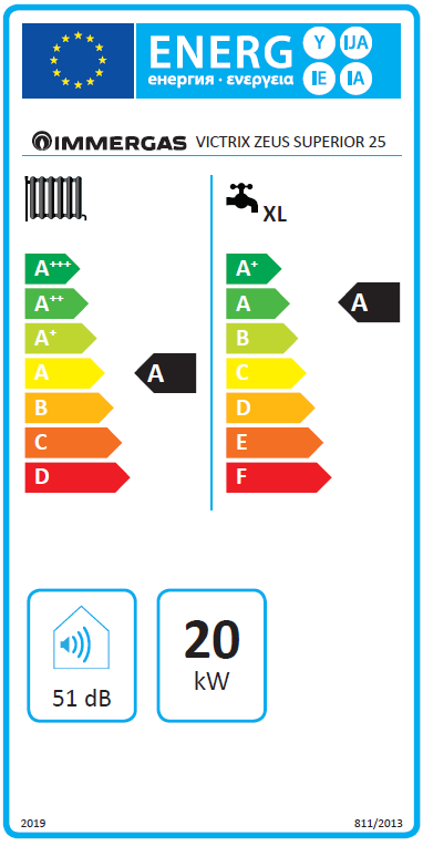- 94% "A" kategória fűtés, "A" XL kategória HMV Szezonális hatásfok (2010/30/EU)