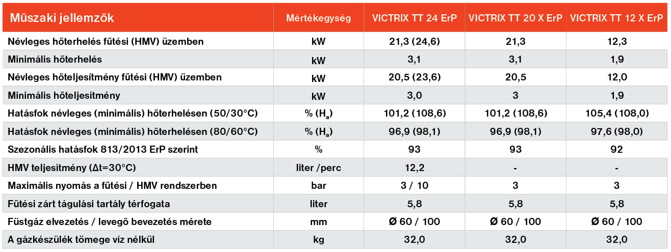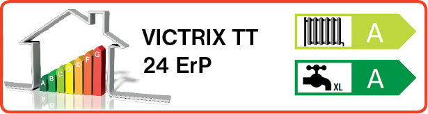 A VICTRIX TT ErP család kitűnő választás fűtéskorszerüsítéshez, vagy akár új rendszerekhez való telepítéshez. A teljes sorozatot úgy tervezték, hogy mindenben megfeleljen a legfrissebb európai direktíváknak és mindamellett növelje a kondenzációs technológia elterjedését azáltal, hogy egy könnyen elérhető magas hatásfokú fűtő és használati melegvíz készítő terméket képvisel a lakossági felhasználásban. A TT rövidítés a “Top Tech” azaz csúcskategóriának felel meg. A VICTRIX TT kazánok a cég Brescelloban található központjában egy teljesen új, automata gyártósoron készülnek, robotok közreműködésével. Valamennyi kazánt elkészülte után tesztelésnek vetnek alá, ezáltal is garantálva, hogy csak hibátlanul működő készülék kerülhessen ki a gyárból. A kazán fő egységét képző innovatív kondenzációs hőcserélő garantálja a kiváló áramlási tulajdonságokat, illetve a rendszerben keringő szennyeződésekkel szembeni magas ellenálló képességet. A készülék károsanyag emissziója alacsony, így a környezetre gyakorolt hatása is minimális. Fejlett kezelőfelülete által kezelése és beállítása egyszerű és rendkívül felhasználóbarát. LCD kijelzőjének köszönhetően az esetleges hibakódok egyértelműen beazonosíthatóak. A VICTRIX TT 24 ErP típus átfolyós üzemben képes használati melegvizet előállítani.